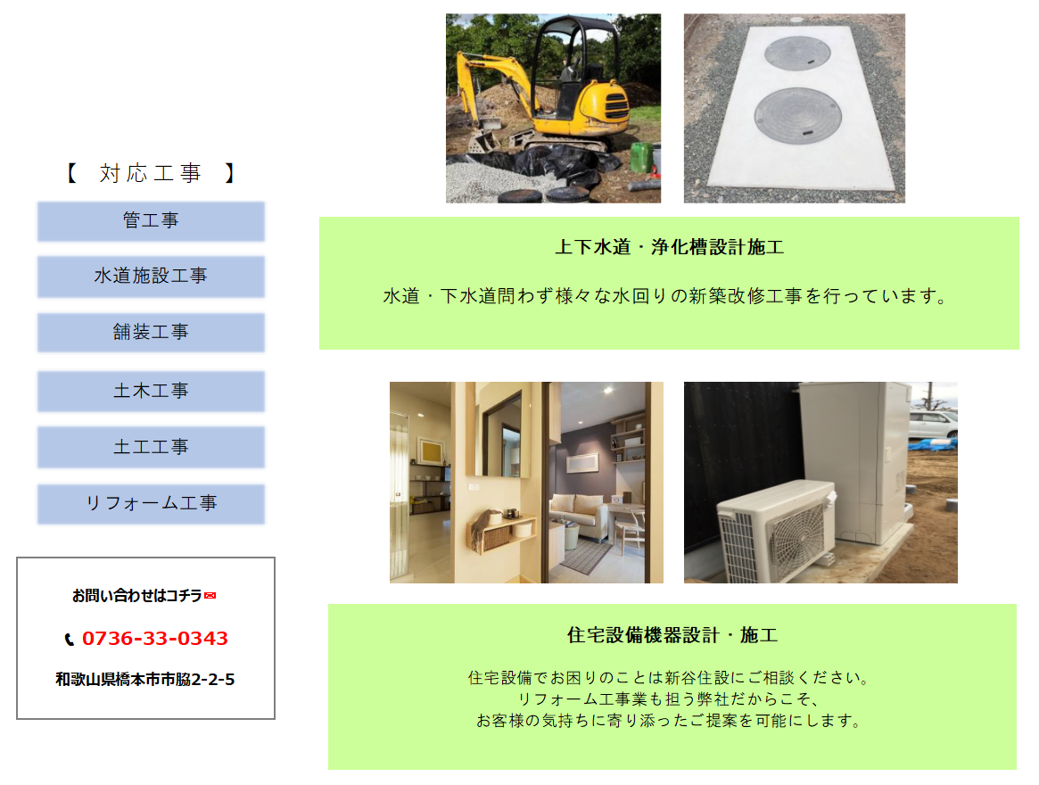 | 事業内容 | 【給排水衛生設備工事の設計・施工】 敷地や建物内における水やお湯の設備や排水のための設備の施工 浄化槽の設置工事や公共下水道への接続工事の施工 【水廻りのリフォーム工事】 流し台 洗面化粧台の取替 節水式トイレへの改修 【水漏れでの早急な修理対応】 |