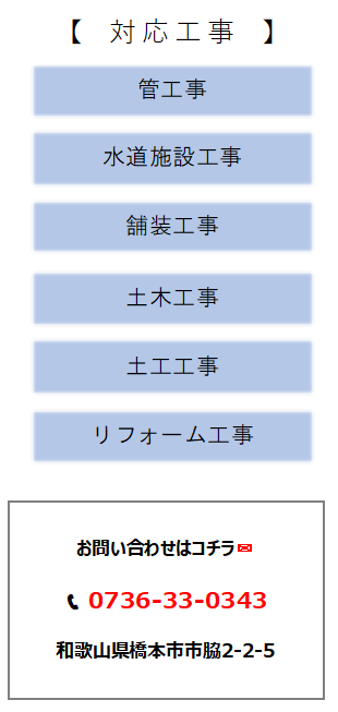 | 営業許可 | 管工事業 土木工事業 水道施設工事業 |