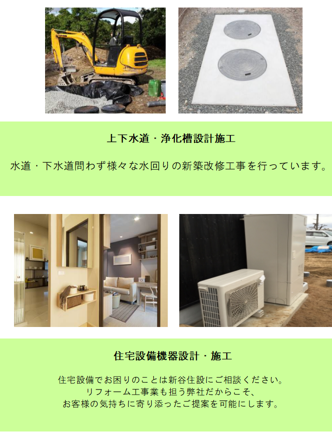 給排水衛生設備設計・施工はじめ上下水道・浄化槽、住宅設備機器などの設備・施工工事を行っております。リフォーム工事もお任せ下さい!水漏れでお困りの場合やご相談いただいた際、修理対応や緊急対応も早急に承ります。